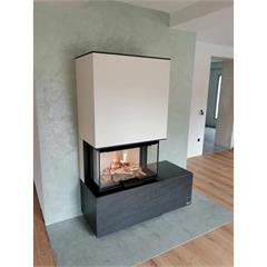 Der L-förmige neocube P22 mit seiner nach rechts ausgerichteten Bank und dem großen Panoramafenster besticht mit seinem schlichten Design und seiner eindrucksvollen Form. Die moderne Feuerstätte integriert sich perfekt in jedes Wohnkonzept.