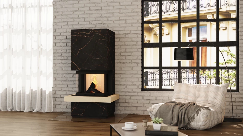 Der neocube P34 erhält seine markante Form durch einen umlaufenden Sims mit Überstand. Durch seine Größe und seinen Aufbau ist der Ofen mit Panoramafenster Mittelpunkt in jedem Raum.