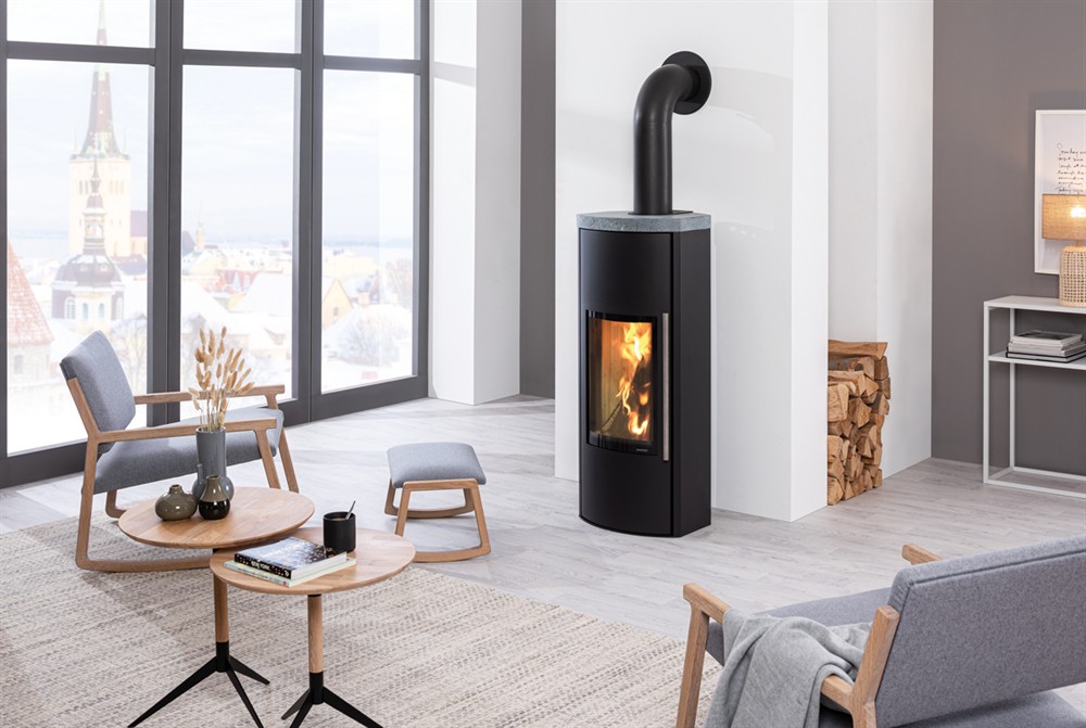 Skanderborg Kaminofen Gira Da inkl. Speicherkern VULKANO Stahl schwarz Abgang oben