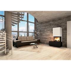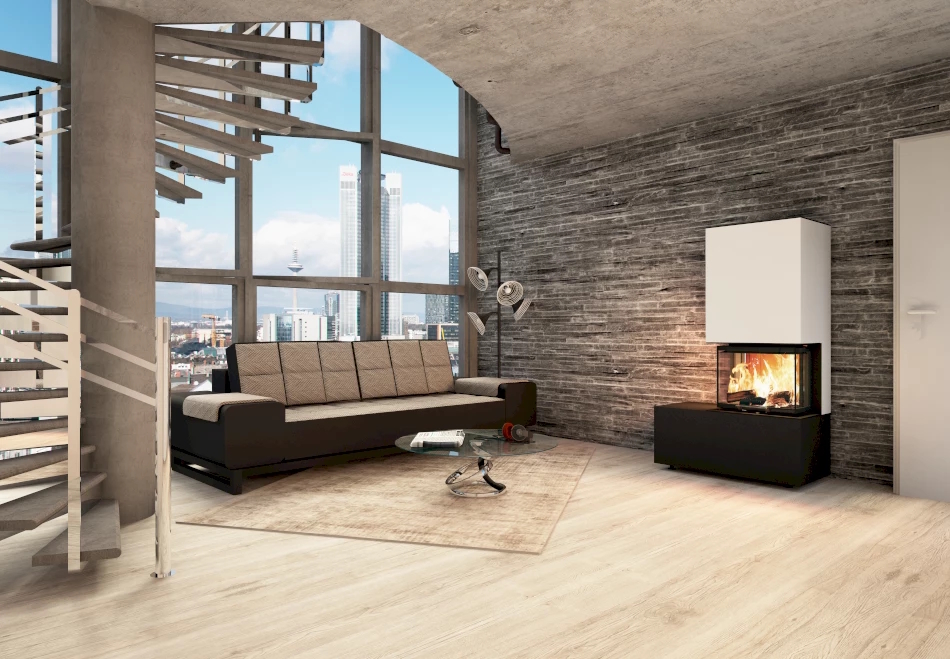 Der neocube P13 fügt sich mit seiner L-Form und der nach links ausgerichteten Bank als moderner Ofen perfekt in das Raumkonzept ein. Ein eindrucksvolles Panoramafenster eröffnet freien Blick auf das Feuer.