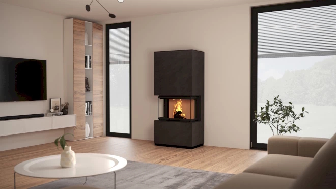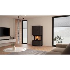 Die schlichte kubische Form des Ofens mit dem großflächigen Panoramafenster fügt sich als modernes Element in den Raum ein.