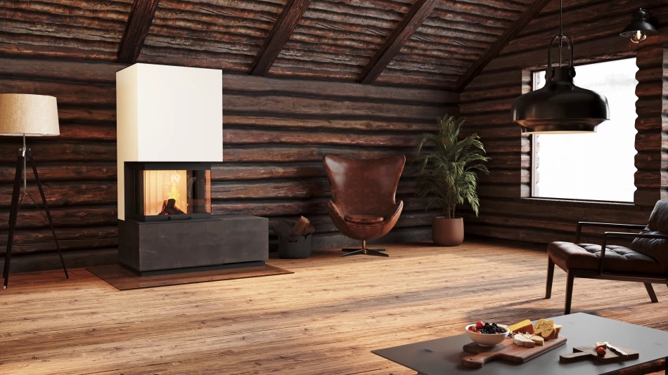 Der neocube P32 wird durch eine nach rechts ausgerichtete Bank in seiner kubischen Form ergänzt und wirkt in Kombination mit dem Panoramafenster offen und modern. Der Ofen wirkt besonders eindrucksvoll in großflächigen Wohnräumen.