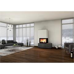Der neocube C12 der Corner-Serie ist mit einem nach rechts offenen Eckfenster versehen und wird mit einer nach rechts laufenden Bank in seiner L-förmigen Anmutung bestärkt. Der Ofen lässt sich perfekt an einer freien Wand oder in einer Ecke positionieren.