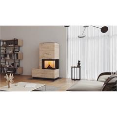 Der neocube C13 der Corner-Serie ist mit einem nach rechts offenen Eckfenster versehen und wird mit einer nach links laufenden Bank in seiner L-förmigen Anmutung bestärkt. Der Ofen lässt sich perfekt an einer freien Wand oder in einer Ecke positionieren.