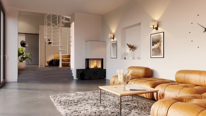 Der neocube C23 der C-Serie verfügt über eine nach links ausgerichtete Bank. Die L-Form des minimalistischen Kaminofens wird durch ein nach links gerichtetes Eckfenster unterstrichen.