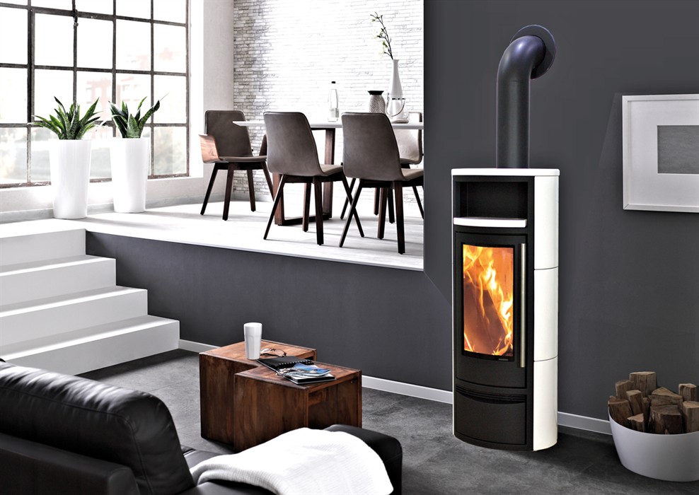 Skanderborg Kaminofen Thea Kachel weiss glänzend Abgang oben