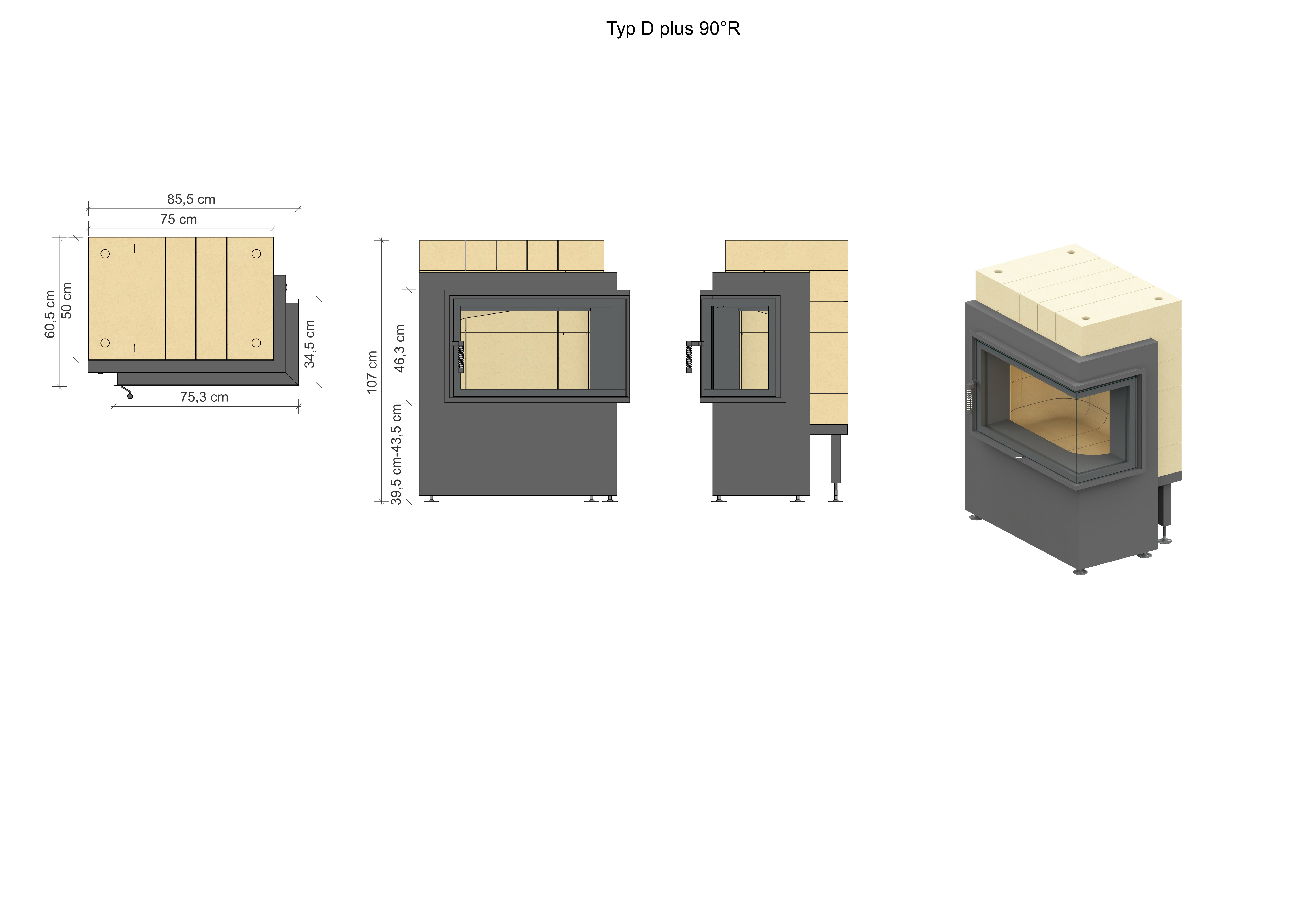 Komplett-Feuerraum Typ D plus 90 ° rechts - B 75 cm, H 87.5 cm, T 50 cm