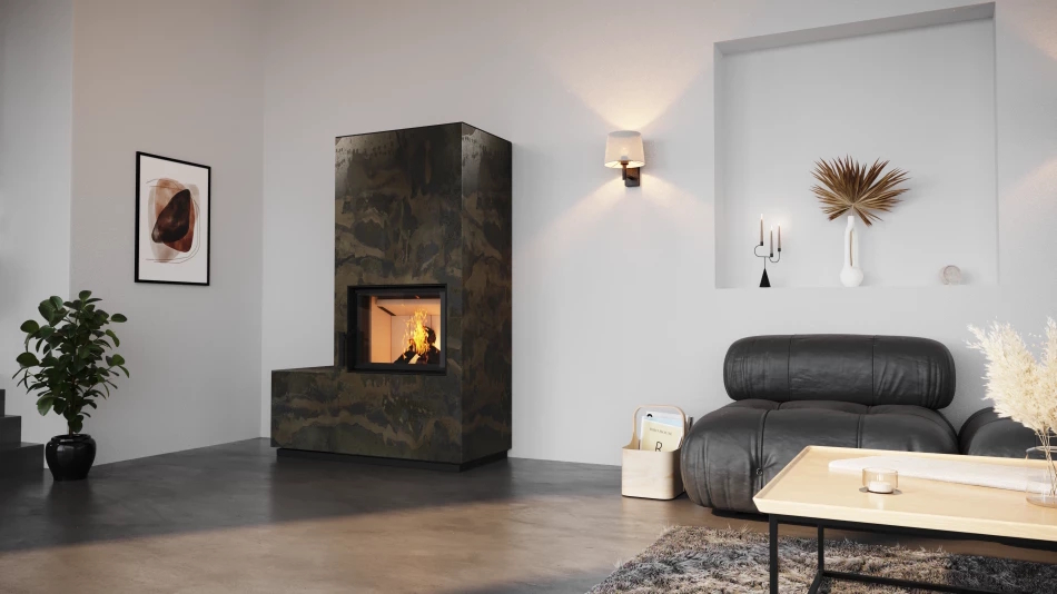 Der neocube F13 verbindet sein schlichtes kubisches Design mit einer nach links ausgerichteten Bank. Die L-förmige Anmutung des Kaminofens und das nach vorne blickende Sichtfenster erzeugen eine wohlige Wirkung im Raum.