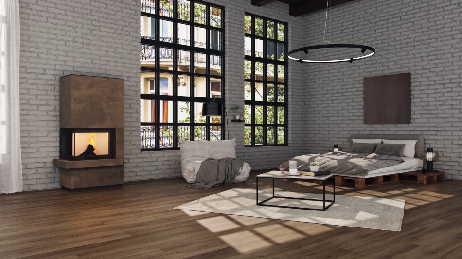 Der rechteckige neocube C24 wird durch einen überstehenden Sims in seiner Schlichtheit durchbrochen. Er sorgt für mehr Spannung in der Optik des Ofens und gibt dem nach rechts ausgerichtete Eckfenster einen Rahmen.
